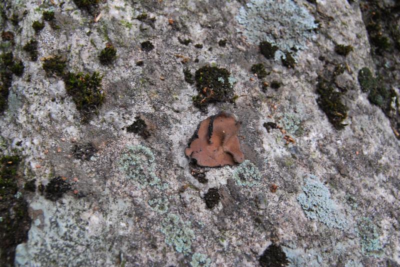 | 種の概要 | モミなどが分布する比較的低山に見られる。花崗岩のような石英質の岩石を基物として付く葉状地衣。背面は灰褐色で平滑,濡れると緑色が強くなる。粉霜は無い。腹面は暗黒色で,黒~黒褐色の偽根を付ける。偽根は良く分岐。中央の臍状体(せいじょうたい)で基物に付く。臍状体を中心として放射状に板状体が発達し,偽根は少ない。髄は白色,C+紅色。古くから食用に利用されてきた。 |