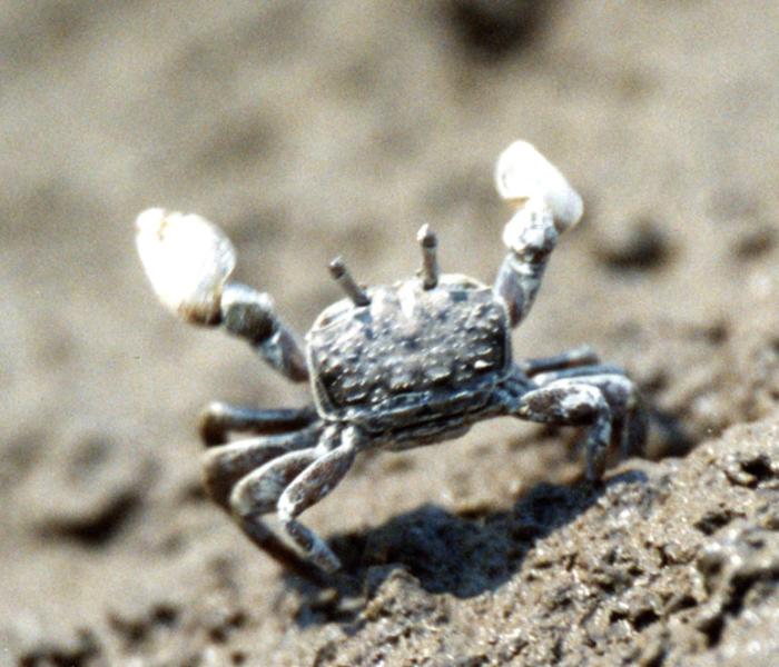 | 選定理由 | 河岸に発達する軟泥干潟の高潮帯~中潮帯に巣穴を掘って生息。海岸部ではほとんどみられない。国内では有明海北部にのみ分布。分布域周縁を除けば優占種で,絶滅の危険は小さい。ただし,堤防改修や河川浚渫などにより,生息地が破壊されることも少なくない。筑後川のような大河川では,河口から20 km 上流の低塩分の水域でもみられる。甲幅10 mm。 |