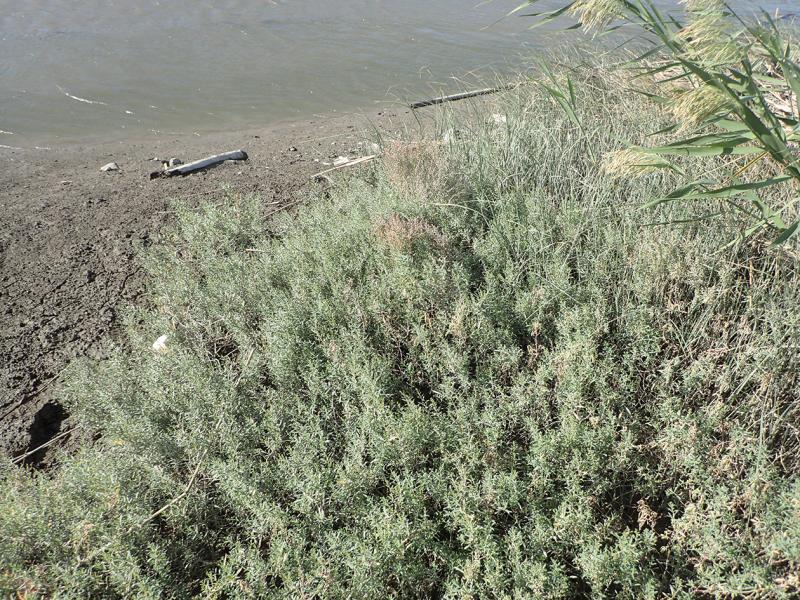 | 群落概要 | 塩沼地の泥地に見られ,群落高は0.6~0.8m程度である。一年草であるヒロハマツナが優占し,純群落を形成するほか,シオクグやシチメンソウが混生する部分も見られる。上述のとおり,現在25m2程度しか残存しておらず,近年,群落の分布域は大幅に減少している。原因として,河道の浸食や遷移進行が考えられる。 |