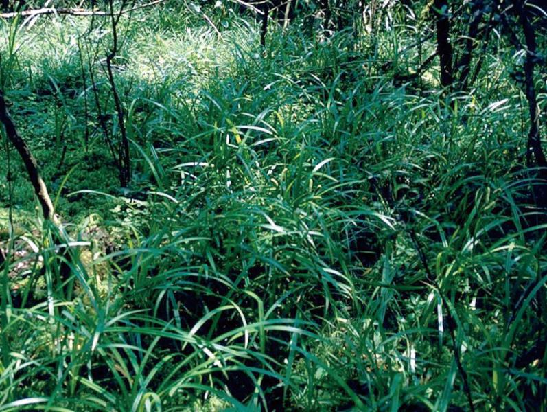 | 群落概要 | ミヤマシラスゲが優占する湿生植物群落。群落高は0.5~0.6mで,純群落状になる場合もある。群落周辺部ではタニヘゴ,ミゾソバ,ヌマトラノオ,ヒメシロネ,ホソバノヨツバムグラ,ハイチゴザサなどが混生する。概して群落面積が小さく,少しの環境変化で消滅する危険がある。ミヤマシラスゲはシカ不嗜好性であるが,ほかの群落構成種が被食されて組成が貧弱化している場所もある。 |