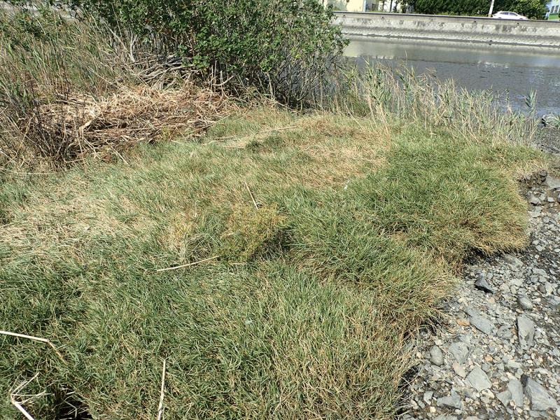 | 群落概要 | 塩沼地の砂礫地に見られ,群落高は0.2~0.3m程度である。ナガミノオニシバが優占し,ハママツナ,ヨシなどが混生する。ナガミノオニシバ群集に該当する。 |