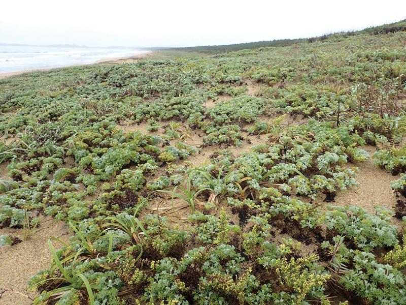 | 群落概要 | 砂丘のやや不安定な立地に成立し,コウボウムギ群落やケカモノハシ群落に接してその内陸側に見られることが多い。群落高は0.1~0.6m程度である。カワラヨモギが優占し,チガヤ,ケカモノハシ,オニシバ,ネコノシタ,ハマボウフウ,ビロードテンツキ,ハマベノギク,ハマハタザオ,ハマアオスゲ,ハマオモトなどが混生する。 |