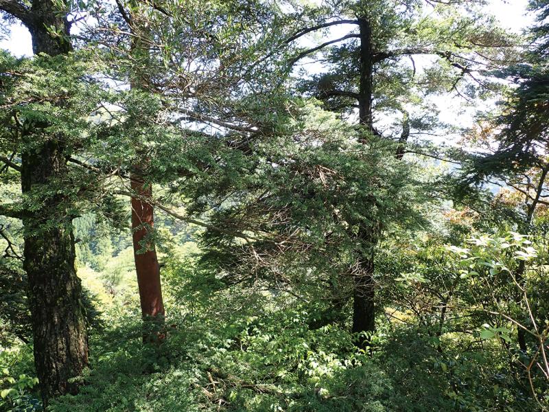 | 群落概要 | ブナクラス域の常緑針葉樹林(ヤブツバキクラス域の上部に位置づける場合もある)。急傾斜地や露岩地に生育する。群落高20mになり,高木層はツガのほかに,モミなどを伴う。亜高木層はコハウチワカエデのほか,アカガシ,ウラジロガシなどが混生する。低木層はハイノキのほか,シラキ,シキミ,ヒサカキなどが混生する。ハイノキ-ツガ群集に該当する。 |