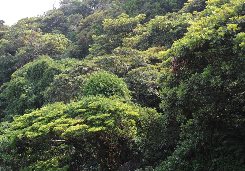 | 群落概要 | 本群落は,林冠にタブノキが優占するほか,ヤブニッケイ,ホルトノキ,オガタマノキ,モチノキ,カゴノキなどが見られ,林床にはヤブツバキ,アオキ,サンゴジュなどの低木,ムサシアブミ,ノシラン,フウトウカズラ,ホソバカナワラビなどの草本を伴う。沖ノ島では出現種数は少ないものの,林床にオオタニワタリ,ヒゼンマユミなどの南方系植物が特徴的に出現する。ムサシアブミ-タブノキ群集に該当する。 |