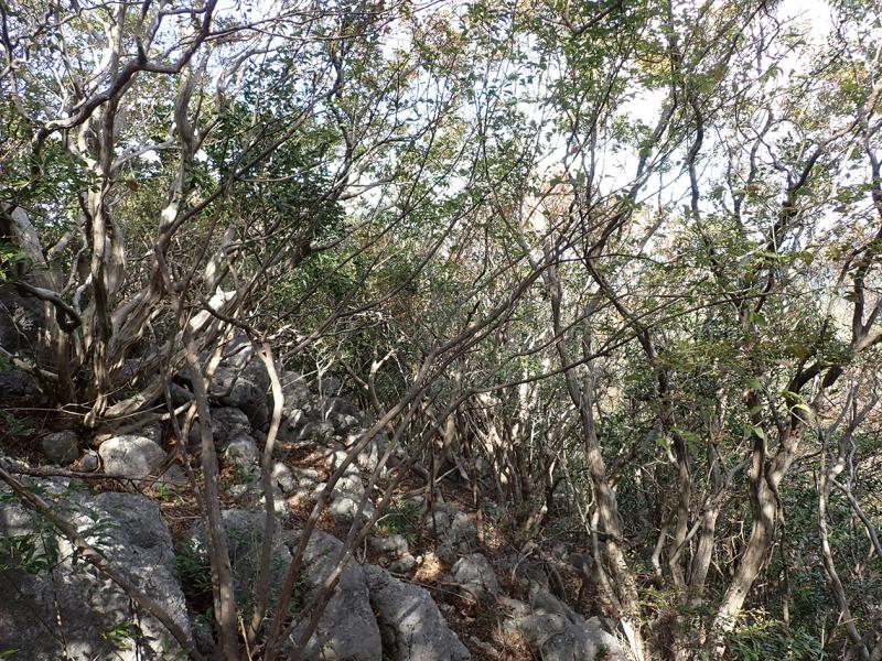 | 群落概要 | ヤブツバキクラス域とブナクラス域の境界付近に成立する落葉広葉樹林。石灰岩地に生育する。群落高5~10mで,亜高木層にイワシデが優占し,低木層にはオオコマユミが多く,イワツクバネウツギ,イブキシモツケ,キビノクロウメモドキ,コバノチョウセンエノキなどの好石灰岩植物が生育する。草本層にはテイカカズラ,シロヨメナ,シロバナハンショウヅル,ホソバヒカゲスゲなどが生育する。イワツクバネウツギ-イワシデ群集に該当する。 |