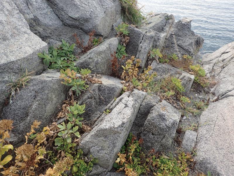| 群落概要 | 海岸断崖地に成立する風衝草原。群落高は0.3~0.5mで,ボタンボウフウが優占し,ホソバワダン,ハマボッス,タイトゴメ,ハマエノコロ,ハマナデシコなどが混生する。ダルマギク群落と同様の立地に成立するが,ダルマギクを欠くことでダルマギク群落と区別される。ホゾバワダン-ボタンボウフウ群集に該当する。 |