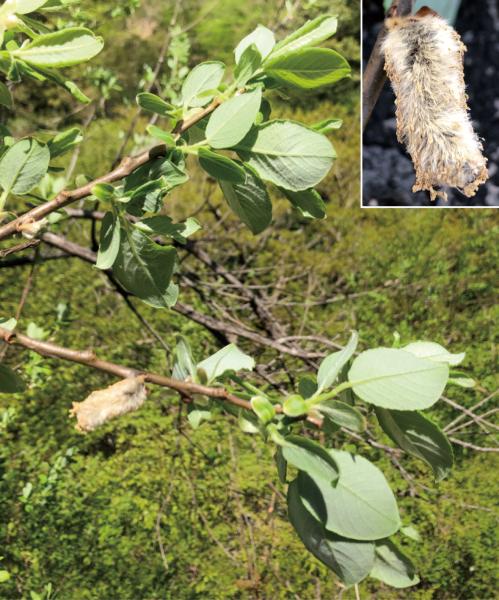 | 種の概要 | 山地に生える落葉低木。株立ちで,高さ2mほどになる。葉は互生し,葉身は長さ5~12cmの倒卵形で,葉縁には浅い波状の鋸歯がある。花期は3~4月で,展葉に先立ち円柱形の尾状花序をつける。雌雄異株で,雄花序は長さ3~4cm,雌花序は長さ2.5~4.0cmで,花序の軸や苞などに鉄さび色の毛を密生する。果実は蒴果で,5月に成熟して裂開する。 |