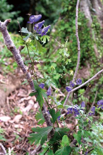 | 種の概要 | 日本産唯一のつる性トリカブトで,暖温帯の林縁・草地に生育する。伸び始めの茎は直立するが,やがて分枝し,ねじれてつる状になり,周りの植物などに巻きつく。葉は鳥足状に5深裂し,裂片は1~2回3裂する。花は散房状花序に数個つき,青紫色。福岡県は分布の北限に当たる。 |