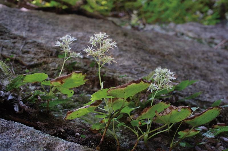 | 種の概要 | 湿った岩上に生える多年草。長めの葉柄と7~11浅裂する丸い葉身を持つ。秋に散房花序をつける。花は5枚の白い花弁を持ち,下側の1または2弁のみがほかより長い。 |