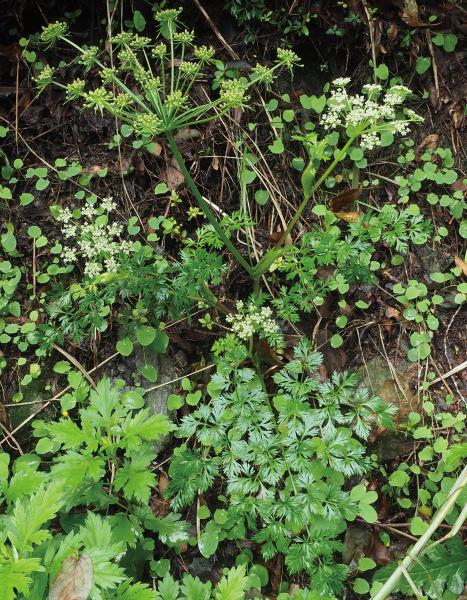 | 種の概要 | 山地に生育する多年草。茎は低く,高さ20~40cmほど。葉は厚く,2~3回三出羽状複葉で,小葉や裂片は深く切れ込む。葉柄は下部または全部が袋状に膨らむ。8~10月に複散形花序に白色の花を密につける。花序は普通総苞片がなく,小総苞片は数個ある。果実は楕円形で,分果の背隆条は脈上,側隆条が狭い翼となる。国内では,本州(岡山県),九州,屋久島に分布する。 |