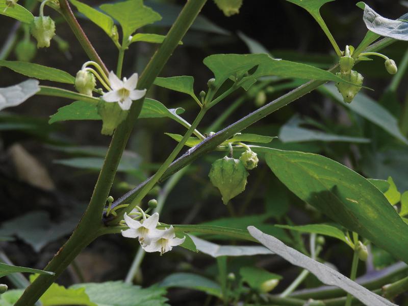 | 種の概要 | 山地のやや湿った林内に稀に生育する多年草。茎は直立し,軟弱で分枝し,高さ30~50cm。葉は薄く卵形,葉身の長さ5~12cm,上半部に粗い鋸歯がある。8~9月,葉腋に1花をつける。花冠は白色で杯形,浅く5裂し,直径7~8mm。萼は果期には液果を包み込んだ袋になる。袋の稜上には刺状突起がある。液果は熟すと黄色。 |