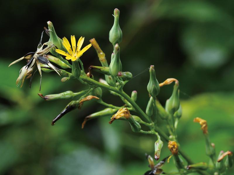 | 種の概要 | 山地の林縁や草地に生育する一年草または越年草。茎は高さ60~200cm。葉は楕円~長楕円形。8~9月,円錐花序に多数の頭花をつける。頭花は直径1cm程度,上向きに咲く。小花は黄色で8~10個。痩果は長さ3.5~4mm,両面に各3肋ある。チョウセンヤマニガナLactuca raddeana var. raddeanaに比べて,小花の黄色が濃いこと,痩果がやや大きく,側面の肋の数が少ないことで区別される。 |