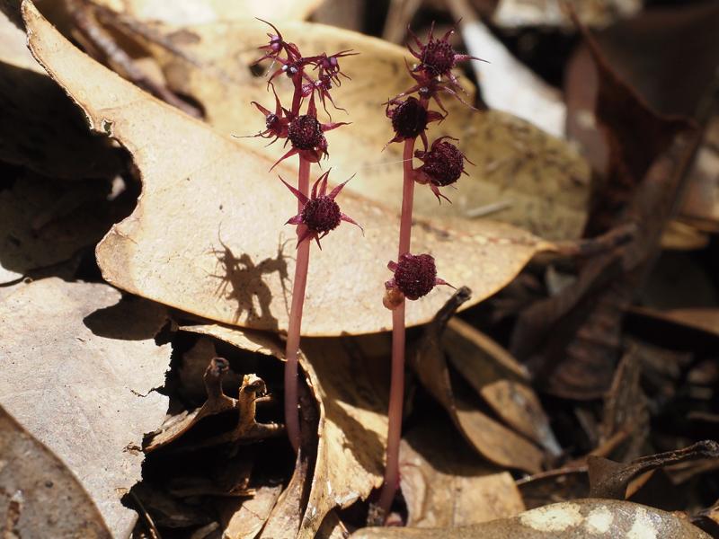 | 種の概要 | 林内の落葉の間に生える赤紫色の菌従属栄養性の多年草。茎は高さ6~10cm。総状花序に3~9個の花をつける。花期は7~9月。 |