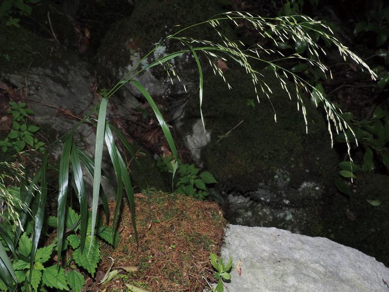 | 種の概要 | 暖帯上部域のやや明るい林内に生える多年草。草丈は90~150cm。下部の茎は数珠を重ねたように膨らみ,葉鞘には下向きの粗い毛がある。 |