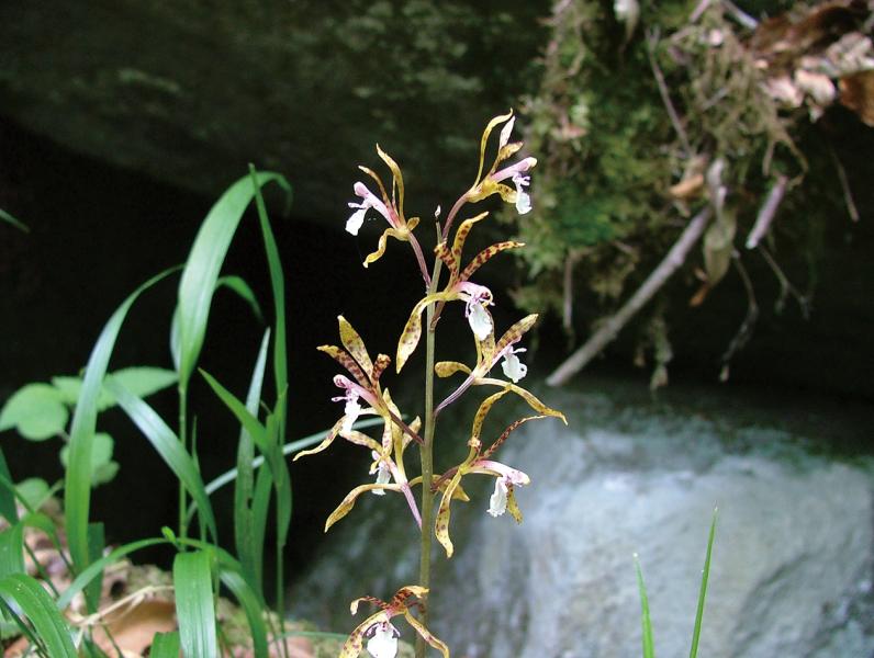 | 種の概要 | 冷温帯の落葉広葉樹林内に生える多年草。花期は5~6月で,高さ30~40cmの花茎を伸ばし,6~12個の花をつける。萼片および側花弁は黄褐色で,紫色の斑点がある。葉は2個,長さ10~12cm,幅3~5cmの長楕円形で,花が終わると枯れ,秋に新葉が出て越冬する。 |