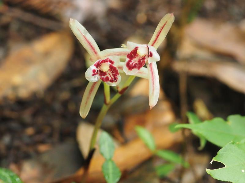 | 種の概要 | 暖温帯~亜熱帯の林下に生育する菌従属栄養植物である。普通は葉と根がない。根茎は長く,地中で繰り返し分枝し,白色で多肉,鱗片をつける。6~10月に2~6個の花をまばらにつける(本県では7月頃と9~12月頃)。花は白色で紅紫色を帯びる。菌従属栄養植物であるが,結実した果実は緑色を帯びており,一部の炭素分を光合成により賄っているとされる(Suetsugu et al.,2018b)。国内では,本州(関東以西)から琉球に分布する。 |