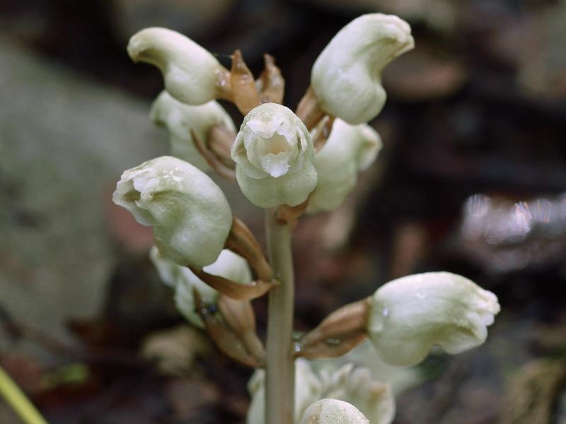 | 種の概要 | オニノヤガラに比べて花茎が短く,花が白色であることなどの点で識別される。花数も異なる可能性があり,オニノヤガラが花茎に20~50個の花をつけるのに対し,本県で確認されているシロテンマの花数は9~17個である。オニノヤガラの変種として分類されているが,シロテンマとオニノヤガラは開花フェノロジーが異なる可能性が指摘されており,別種である可能性が指摘されている。国内では本州,四国,九州の一部に分布する。 |