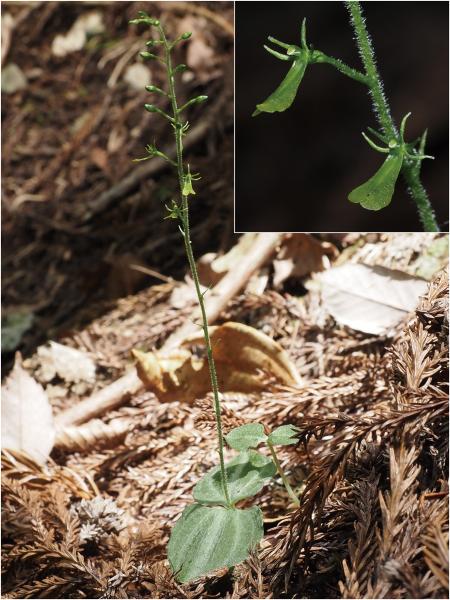 | 種の概要 | 冷温帯の樹林下に生育する多年草。茎は直立して10~20cmほど,茎の下方に一対の普通葉が開出してつく。葉は青緑色で,不鮮明な白い斑がある。7~8月に帯緑色の花をまばらに5~20個つける。唇弁は,基部に耳状裂片がなく,先端が円頭の2片に切れ込む。本州,四国,九州に分布する。 |