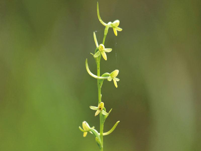 | 種の概要 | 日当たりのよい湿った草原に生育する多年草。根の一部は紡錘状に肥大する。茎は高さ20~40cmほどで極めて繊細。葉は1個で広線形,長さ3~7cmほどで基部が茎を抱く。6~8月に淡黄緑色の花を数個つける。距は長さ12~18mmで,普通後方に跳ね上がる。国内では,北海道,本州,四国,九州に分布する。 |