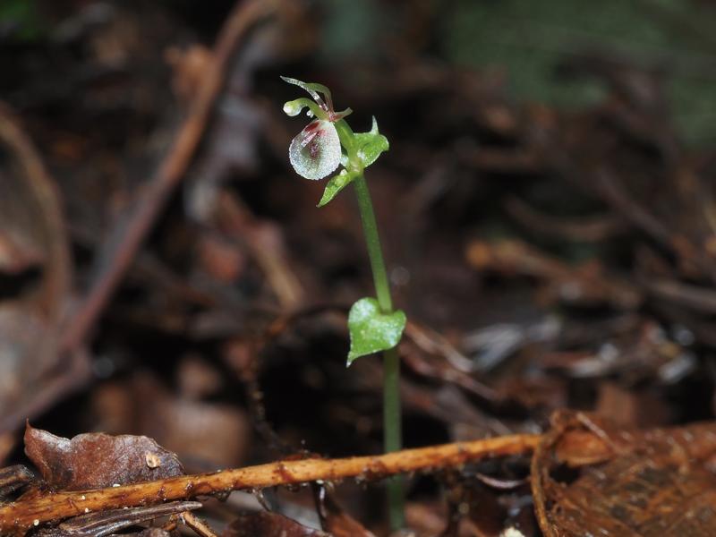 | 種の概要 | 暖温帯の常緑広葉樹林下またはスギ林下に生育する多年草。球茎は2~3mmで,高さ3~10cmの地上茎を出す。葉は茎の中央より上部に1個つき,卵形で長さ3~5mmほど。8~9月に淡緑色で僅かに紫色を帯びた花を2~3個ほど茎頂につける。国内では,本州(和歌山県・伊豆諸島),四国,九州に分布する。 |