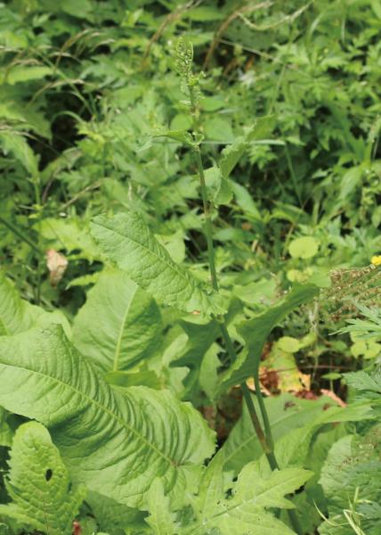 | 種の概要 | 渓流沿いに生える大きな多年草。茎は直立し,高さ70~160cm。葉は長卵形~長楕円状卵形でエゾノギシギシより大きく,裏面の脈上に短毛を密生する。花期は5~7月。花序は円錐状で断続的に花を輪生し,枝には葉状の苞はない。果時の翼状萼片は広心形で横縁に刺毛状の鋭鋸歯があり,翼状萼片の中脈はほとんど膨れないか,3個のうち1個が少し線状に膨れる。日本固有種。 |