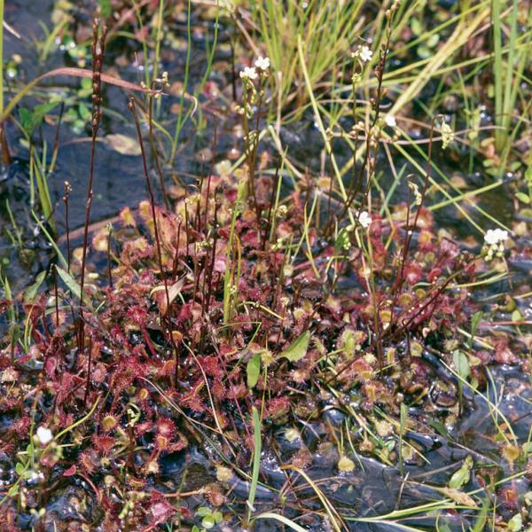 | 種の概要 | 日当たりのよい貧栄養な湿地や水の滴る崖斜面などに生育する多年草。食虫植物として知られている。根出葉はロゼット状になり,葉身は倒卵状円形で,長さ5~10mm,表面に紅色の腺毛がある。6~7月,高さ6~20cmの花茎が伸び,総状花序がつく。花弁は5個,白色で長さ5mm前後。 |