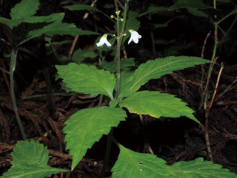 | 種の概要 | 山の木陰に生育する多年草。細い地下茎がある。茎は高さ6~40cm,長い軟毛があり,まばらに分枝して葉を対生する。葉柄は0.5~2cmほど。葉は薄く,卵形~菱状卵形,粗い鋸歯があり,表面には独特な艶があり,裏面には腺点がある。8~10月頃に2~10cmの花序に白色の花をまばらにつける。花はやや下向きにつき,花冠は5~6mm。国内では,本州~九州に分布する。 |