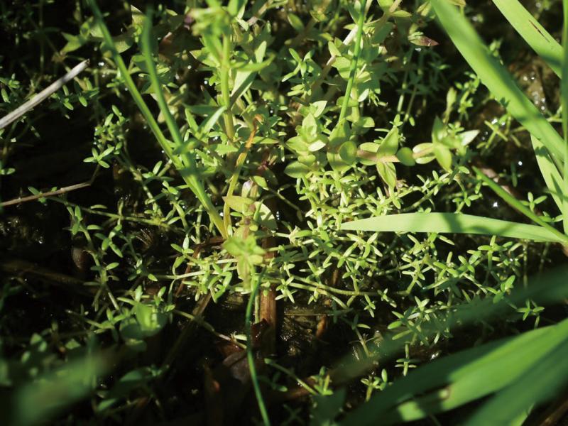 | 種の概要 | 水田や湿地に生育する一年草。茎は地表をはい,よく分枝し,長さ5~10cm。葉は対生し,広線形から狭楕円形,長さ2~5mm,幅1~2mm。花期は7~10月で,花は節ごとに1個つける。花冠は紅紫色,長さ約2mm,5裂する。小さな水田雑草である。 |