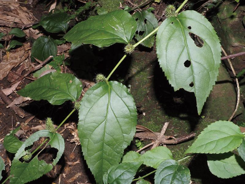 | 種の概要 | 低地の林内や林縁に生育する多年草。茎は湾曲して垂れ下がり,長さ70~150cm。葉は互生し,卵形または楕円状卵形で,縁には三角状のとがった鋸歯があり,長さ6~11cm,両面無毛で,裏面は普通紫色を帯びる。8~9月,葉腋に短い円錐形の花序を出し,密に花をつける。花冠は紅紫色~紫色で,長さ5~6mm。 |