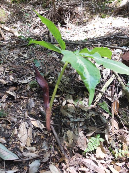 | 種の概要 | 山地の林内に生える多年草。葉は通常1個,小葉は鳥足状につき,仏炎苞は大型で濃紫色。高さ15~40cm。 |