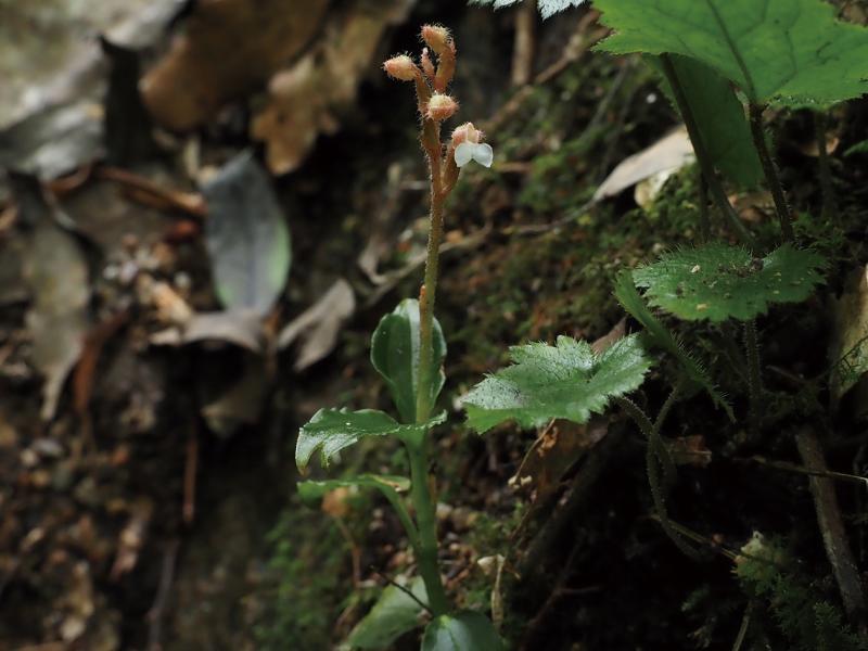 | 種の概要 | 暖温帯の林下に生育する多年草。開花時の茎は10~15cmほど,葉は4~7個つき卵形~楕円形。7~8月に帯紅色の3~7花を総状花序にやや密につける。背萼片は卵形,側萼片は広卵形。唇弁は萼片より長く,爪部は卵円形で内面の基部に角状の突起を2個つけ,舷部は2深裂する。花茎,苞,子房,萼片の外部に粗い毛がある。九州に稀に分布する。 |