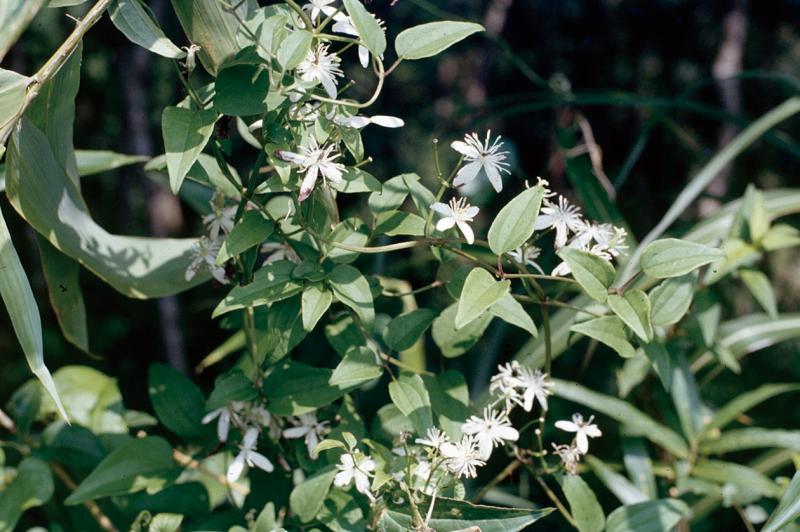 | 種の概要 | 林縁や草地に生育するつる性木本。植物体は乾くと黒色~暗褐色になる。葉は普通奇数羽状複葉で小葉は全縁。茎頂や葉腋につく集散花序は,花数が多ければ円錐状になる。花は白色で平開,上向きに咲く。 |