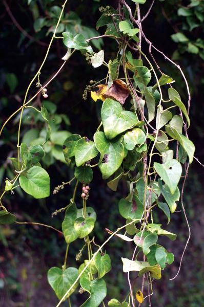 | 種の概要 | ハート形の葉身と盾着する葉柄を持つ雌雄異株の木本性つる植物。夏~秋に開花結実する。丸い果実が総状につき,最初は緑色でピンク色に熟す。 |