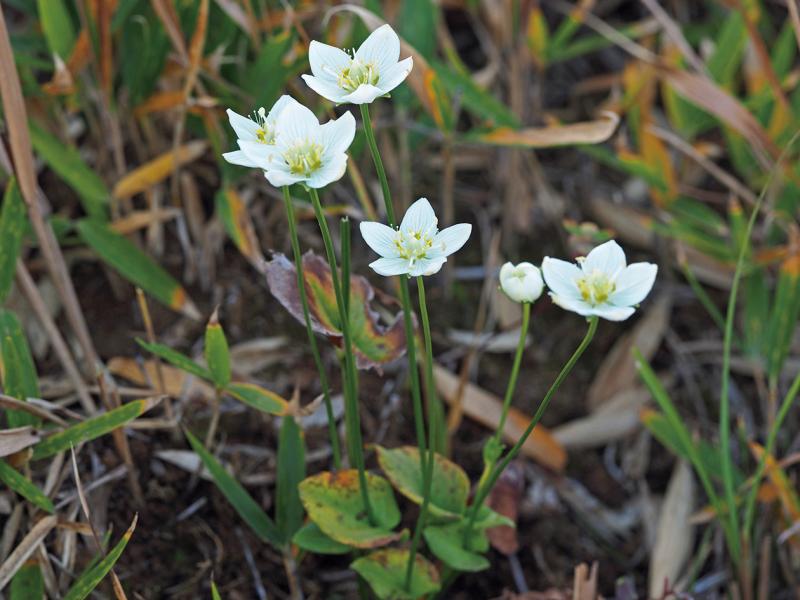 | 種の概要 | 日当たりのよい草地に生える多年草で,束生する根出葉と直立する花茎を持つ。花茎は途中に1枚の茎葉をつけ,先端に径2cm程度の白花を単生する。APG分類ではニシキギ科に含まれる。 |