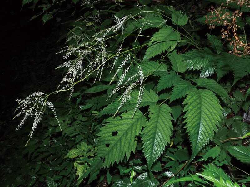 | 種の概要 | 冷温帯林内の岩場の壁面に生えることが多い多年草。高さ30~100cmになる。葉は互生し,2回三出複葉。小葉は長さ3~10cmの卵形で,葉縁には欠刻と鋸歯がある。花期は6~8月で,茎の先に長さ10~30cmの円錐状の花序を出し,白色の小さな花を多数つける。雌雄異株。 |