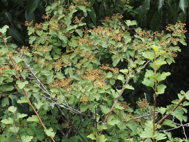 | 種の概要 | 山地の岩場に生える落葉低木。高さ1~1.5mになる。葉は互生し,葉身は長さ2~4cmの菱形状卵形で無毛。葉縁の上半部にはふぞろいの鋸歯があり,時に3~5中裂するものがある。花期は5月で,今年枝の先端に散房状につき,直径約7mmの白い花を20~40個つける。果実は袋果で,7~8月に熟す。 |