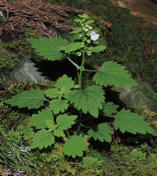 | 種の概要 | 山地の木陰に生育する多年草。茎は直立して5~15cm,節より枝を出し,開出する腺毛が上部に散生する以外は無毛。葉は対生し,葉柄は1.5~2.5cm。葉は広卵状三角形で長さ2~3cm,鋭頭,縁には数個の鋭い鋸歯がある。7~8月に花序にまばらに花をつける。花冠は白色で僅かに淡紅色を帯び,長さ7~8mm。国内では,北海道~九州に分布する。 |