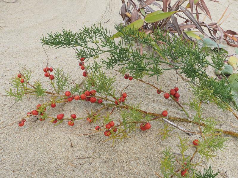 | 種の概要 | 海岸に生育する多年草。茎は50~80cmほど,まばらに分枝してはうように広がる。クサスギカズラに似るが,太い枝の葉は刺状にならない。葉状枝は葉腋に3個ほど束生し,湾曲せず,長さ5~25mm。雌雄異株。果柄は1.8~2.2mmほど,中央部付近に関節がある。果実は赤く熟す。国内では,本州(中国地方)~九州(北部~西部)に分布する。 |