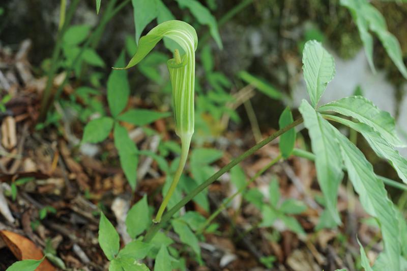 | 種の概要 | 夏緑樹林の林床に生育する多年草。高さ15~55cm。葉は1枚で,5~7枚の小葉が掌状につく。小葉は卵形から楕円形で,長さ6~20cm。花期は5~6月で,花は葉より下部につく。仏炎苞は黄緑色から緑色,先は卵形で鋭頭である。 |