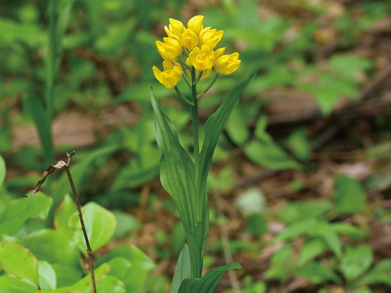 | 種の概要 | 暖温帯の疎林下に生育する部分的菌従属栄養の多年草。ブナ科などの樹木と共生関係にある菌根菌に寄生する。根茎は短く,茎は高さ30~70cmで稜がある。葉は広披針形で長さ8~15cm,幅2~4cm,厚く縦脈が多い。4~6月に黄色の花を3~12個つける。苞は三角形。萼片は卵状長楕円形で14~17mm。側花弁は卵形で萼片より少し短い。唇弁の基部は筒状で距となる。国内では,本州~九州に分布する。 |