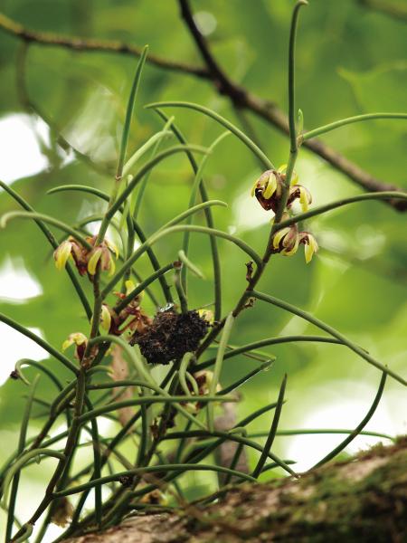 | 種の概要 | 低山地のクロマツやクスノキなどの樹幹に着生する多年草。葉が多肉質の棒状で,茎に似ていることからこの名前が付いている。 |