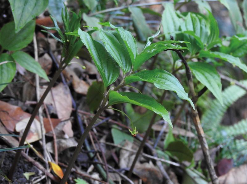 | 選定理由 | 英彦山地,福智山地,脊振山地,古処山地,釈迦岳山地などの山地上部域に自生する。釈迦岳山地では5,000個体以上が見られた。時に群生し,生育良好であり,継続的な減少は推測されなかった。脊振山地や福智山地でも個体数が多く,おおむね生育良好であったが,福智山地では常緑広葉樹の成長に伴う林床の被陰が懸念される。以上の状況を踏まえ,カテゴリーを絶滅危惧II類から準絶滅危惧に変更した。 |