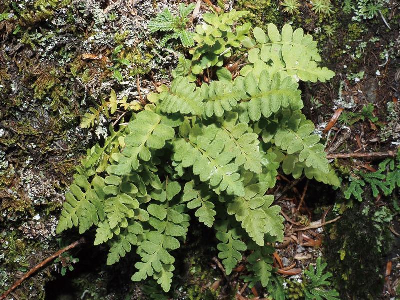| 種の概要 | 山地のやや明るい岩上に生育する夏緑性のシダ植物。根茎は斜上~直立し,多数の葉をつける。イワデンダとコガネシダの中間的な形態を示すが,イワデンダに比べて側羽片の下側がより切れ込み,コガネシダに比べて側羽片の切れ込みは浅い。イワデンダとコガネシダの中間型の個体が両種の雑種(不稔雑種)である場合も報告されており,同定には胞子の状態を確認することが必要である。国内では,本州~九州に分布する。 |