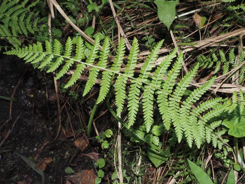 | 種の概要 | 山地の明るい湿地に生育する夏緑性のシダ植物。根茎は長く匍匐し,生育地では群生する。葉身は披針形で,側羽片が葉身の下部にかけて短縮することが特徴。ソーラスは裂片の辺縁寄りにつくが,裸葉の場合が多い。国内では,本州~九州に分布する。 |