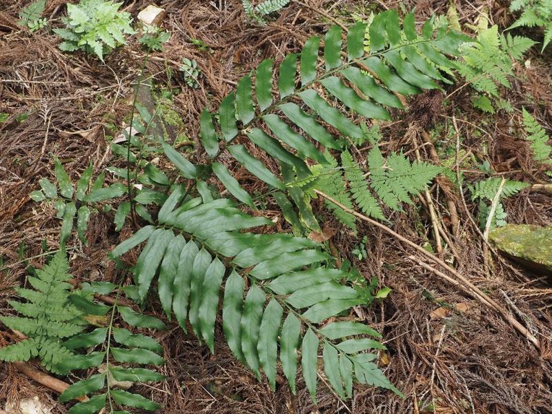 | 種の概要 | 山地の林床に生育する常緑性のシダ植物。根茎は直立~斜上し,葉を叢生する。葉は1回羽状複生で,硬くもろい紙質,淡緑色でやや光沢がある。本種はイノデ属であるが,葉身の外観はヤブソテツ属によく類似している。多くのヤブソテツ属とは側羽片の基部上側に耳片が発達しない点,葉柄の鱗片がまばらな点で識別できる。小型の葉ではオトコシダにも類似するため注意が必要である。国内では山口県と九州に分布する。 |