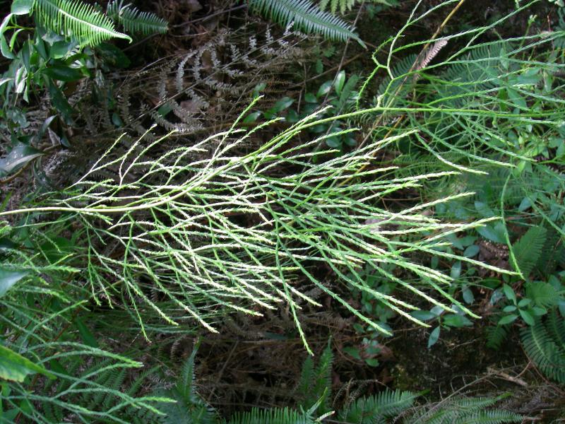 | 種の概要 | 明るい林内・林縁に生育する常緑性のシダ植物。主茎は長く紐状に伸長しながら枝を分け,各枝は二叉分枝しながら伸びる。胞子嚢穂は側枝の先端に1~2個つく。本種は亜熱帯~熱帯要素の種であるが,国内では本州~九州に点在する。本県は九州における分布の北限域である。 |