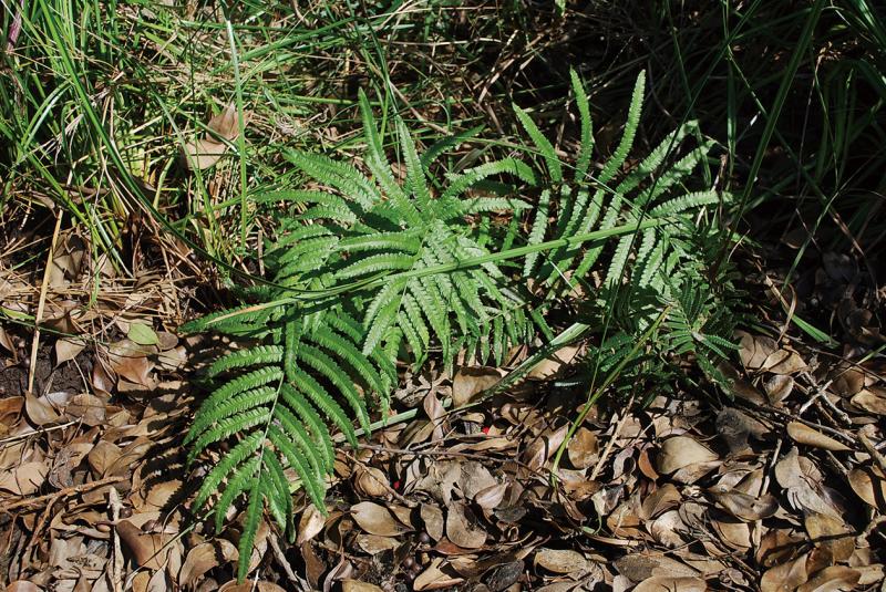 | 種の概要 | 明るい湿地環境に生育するシダ植物で,本県では常緑性である。根茎は長く匍匐し2回羽状浅裂程度の葉をつける。種名のとおり,葉はホシダよりも硬く革質である。ソーラスは裂片の辺縁寄りにつく。本県での生育環境は,ため池,放棄水田やその水路沿いである。国内では,本州~琉球に分布する。 |