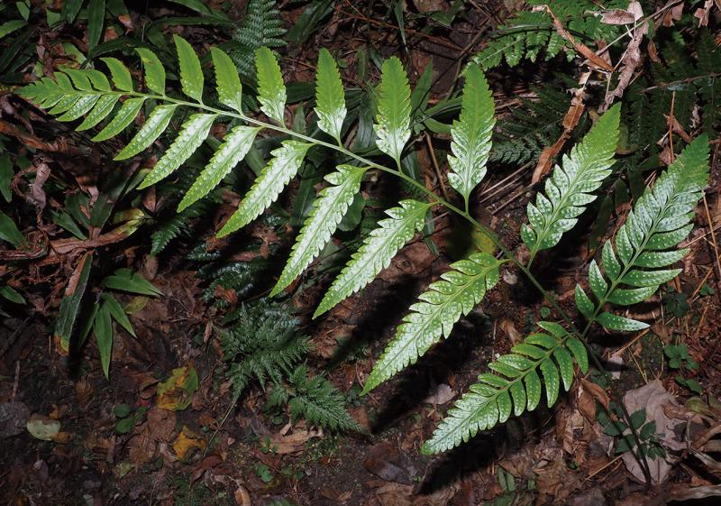 | 種の概要 | 山地の渓流沿いなど湿潤な林下に生育する常緑性のシダ植物。根茎は短く匍匐し,葉は大きさによるが2回羽状複生程度,光沢のある濃緑色で硬い紙質である。側羽片は葉の上部にかけて徐々に短縮し,明瞭な頂羽片は形成しない。ソーラスは中間生である。国内では,本州~九州に分布する。 |