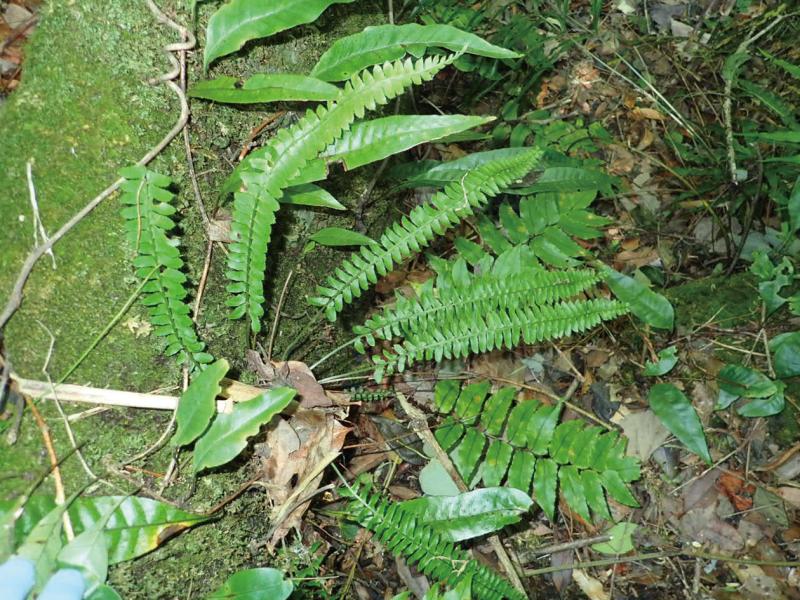 | 種の概要 | 石灰岩の岩上に生育する常緑性のシダ植物。根茎は斜上~直立し,葉を叢生する。葉柄基部の鱗片は褐色であるが,先端部が黒褐色を帯びる。ソーラスは辺縁寄りに1列に並び,側羽片の上側に多くつく。県内の分布域には類似種のツルデンダも出現するが,タチデンダは葉の先端に無性芽をつけないため識別は容易である。国内では,本州(山口県),四国(高知県),九州に分布する。 |