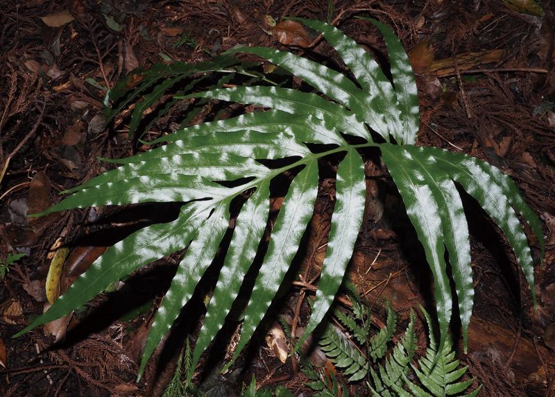 | 種の概要 | 暖地に生育する常緑性のシダ植物。根茎は長く匍匐する。葉は1回羽状複生,光沢があり,緑色。ソーラスは線形で,中肋にほぼ接するようにつく。九州南部域では普遍的に見られるが,本県では稀である。本県には近縁種イワヒトデも分布するが,オオイワヒトデは根茎がより太く,葉の裏面の葉脈が明瞭に見える点などにより識別は容易である。国内では,四国,九州,琉球に分布する。 |